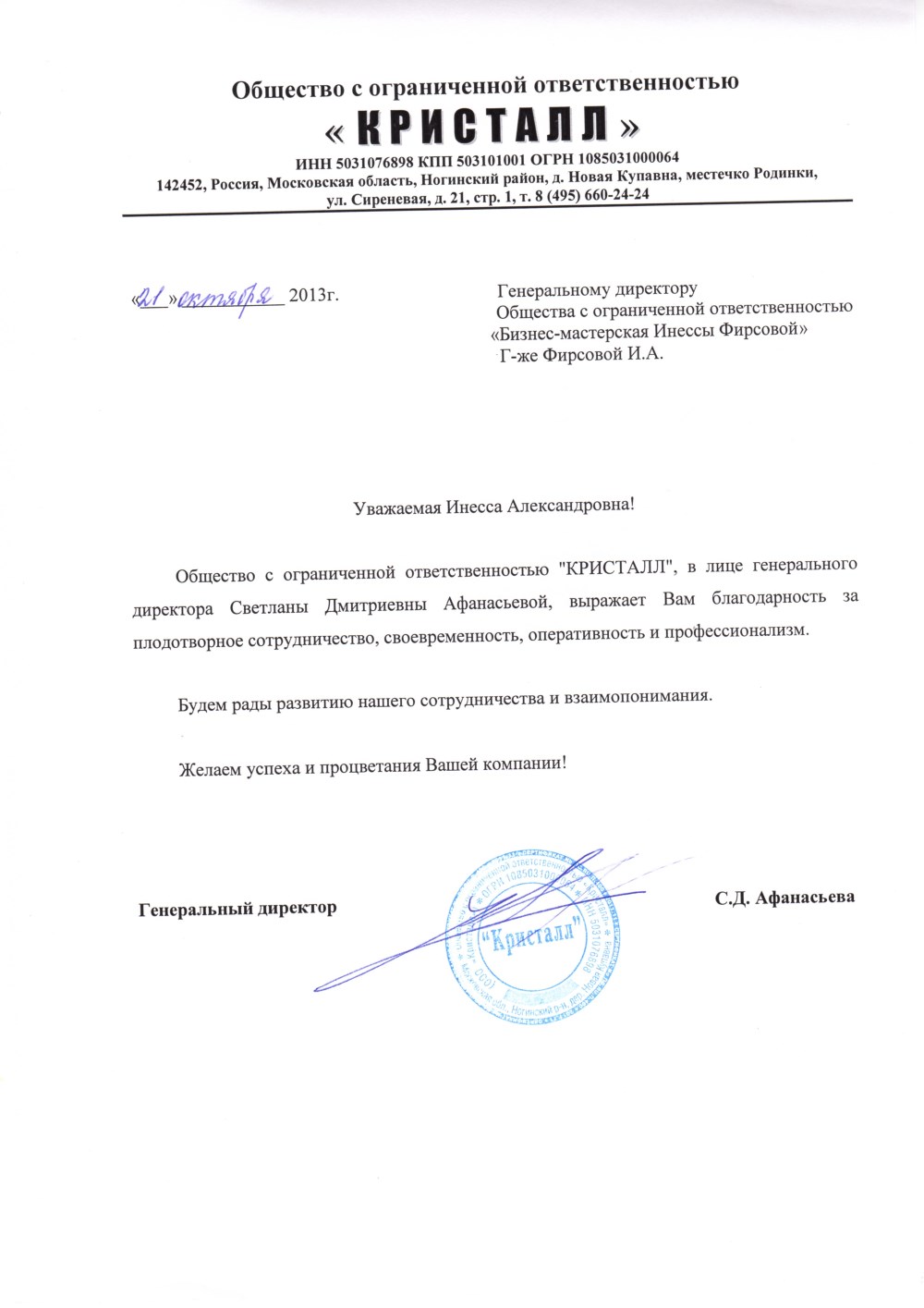 Общество с ограниченной ответственность «Кристалл», выражает благодарность за плодотворное сотрудничество