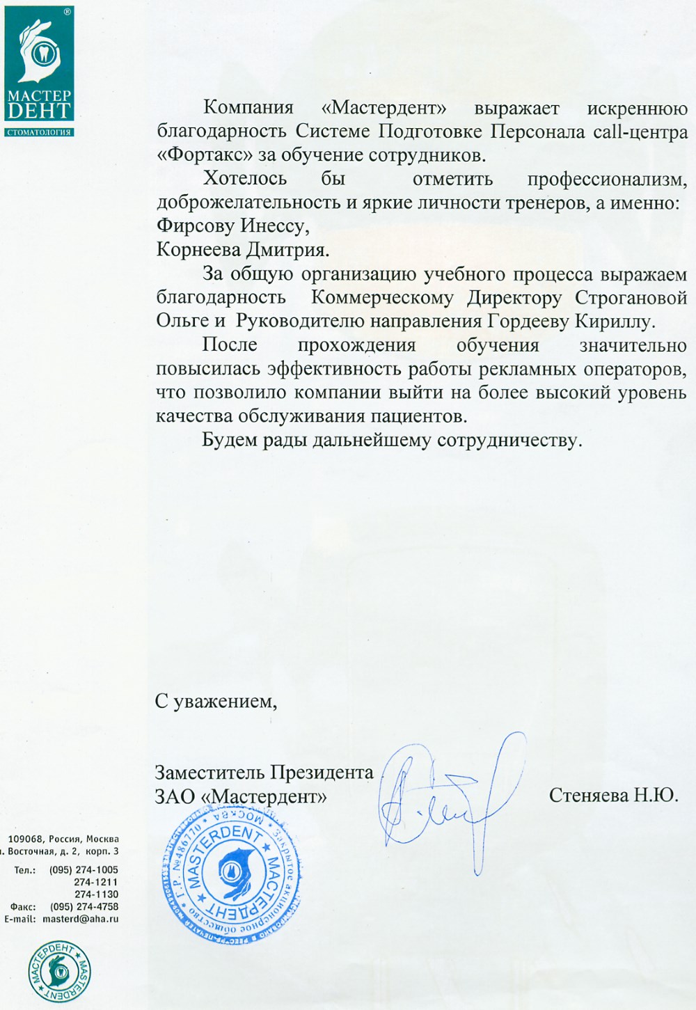 Компания «Мастердент» выражает искреннюю благодарность Системе подготовке Персонала call-центра «фортакс» за обучение сотрудника